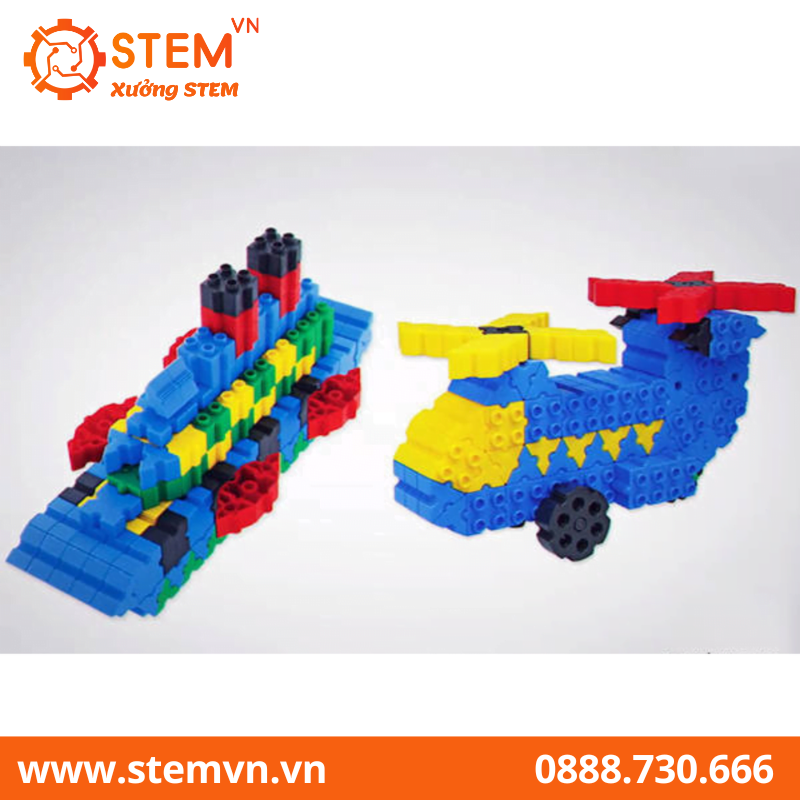 – Mô tả sản phẩm: gồm 1 hộp giấy Carton có nắp đậy tiện dụng để lưu trữ các chi tiết; 200 mảnh ghép đa chiều hình tam giác, hình vuông, các bánh răng và các thanh ghép hình trụ nhiều màu sắc; 1 cuốn sách/cuốn album hướng dẫn sử dụng đi kèm.