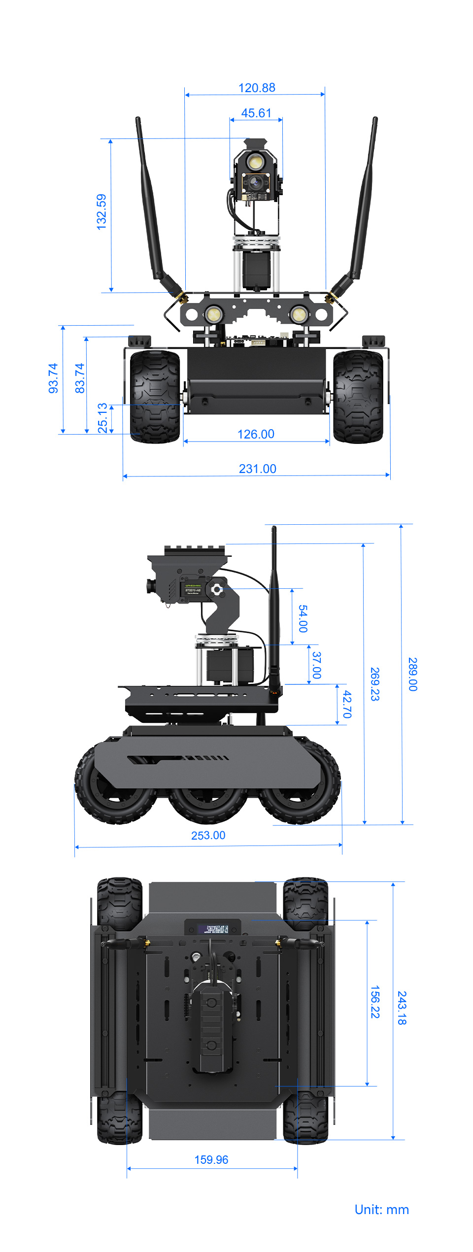 - Hệ thống truyền động : Cấu hình 6 bánh xe với hệ dẫn động 4 bánh (4WD) cho lực kéo và độ ổn định tốt hơn trên địa hình không bằng phẳng hoặc gồ ghề.
