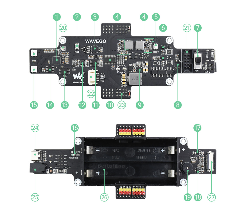 WAVEGO robot giống chó bionic 12DOF là một robot giống chó bionic có DOF cao, có servo mô - men xoắn lớn 2,3kg.cm, cấu trúc đáng tin cậy và chuyển động linh hoạt, tích hợp các thiết bị như camera trước, bộ theo dõi chuyển động 9 trục, đèn báo RGB, v.v., cùng với ứng dụng Web đa nền tảng nguồn mở. Nó sử dụng ESP32 làm bộ điều khiển phụ để giải toán ngược thanh kết nối và tạo dáng đi, chia sẻ nhiệm vụ tính toán cho bộ điều khiển chủ, có thể gắn thêm Raspberry Pi làm bộ điều khiển chủ để vận hành quyết định cấp cao.