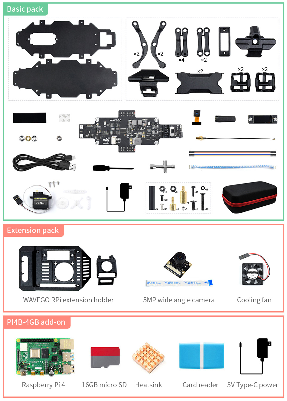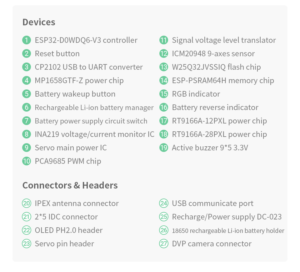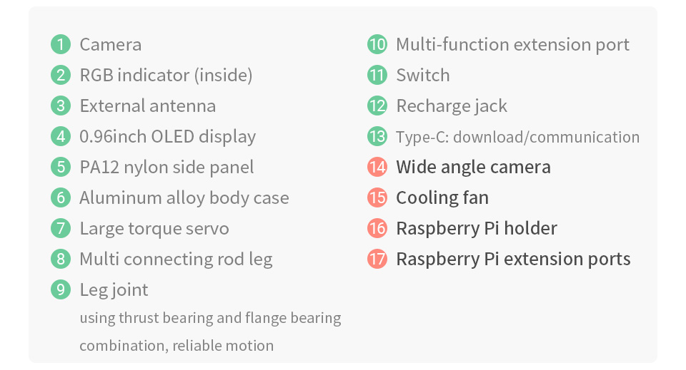 - Raspberry Pi bổ sung có thể được gắn làm bộ điều khiển máy chủ để kích hoạt các chức năng cấp cao của OpenCV, mã demo bao gồm nhận dạng khuôn mặt, phát hiện chuyển động, theo dõi màu sắc, v.v. Giao diện mở rộng dành riêng cho phát triển thứ cấp, cùng với hướng dẫn sử dụng và tài liệu phát triển thứ cấp.